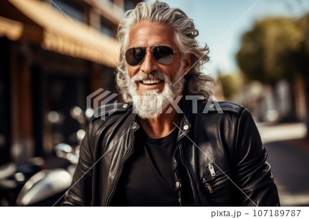 A senior hipster, aged around 72, wearing a vintage leather motorcycle jacket and aviator sunglasses, straddling a retro motorcycle in an urban environment. Generative Ai