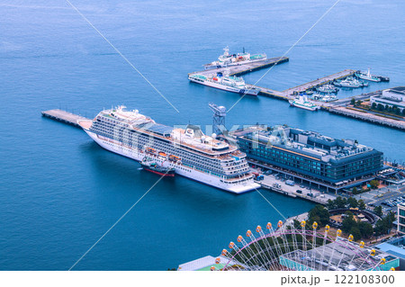 日本の横浜都市景観初入港した新港ふ頭のシーボーン・クエストが夕方出港…=30日