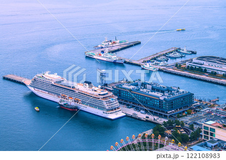 日本の横浜都市景観 あかいくつやダイヤモンド・プリンセスなどを望む。(オイローパ2が初入港)