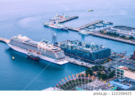 日本の横浜都市景観 あかいくつ2台やダイヤモンド・プリンセスなどを望む。(オイローパ2が初入港)