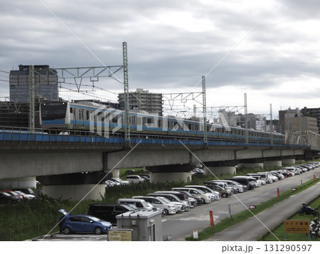 曇り空の都市鉄道:高架橋を渡る京浜東北線と駐車場