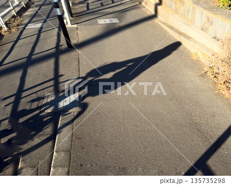 路肩の手すりと違法駐輪自転車の夕刻の影とのコラボ