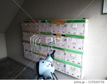 集合住宅の年季の入った郵便受けと原付バイク