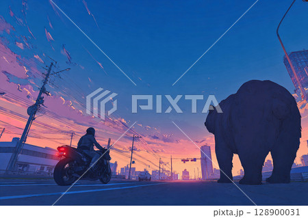 夕暮れの街で出会ったバイク乗りとクマのアニメ風シーン