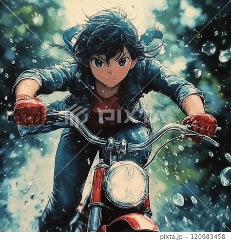 「疾走感あふれるバイクライダー | 雨の中の冒険」