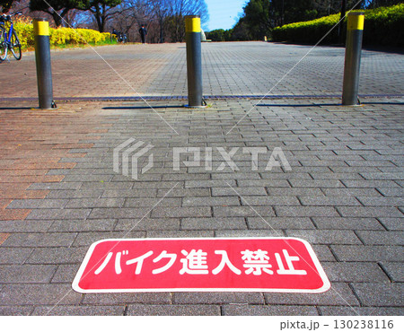 「バイク進入禁止」の表示が路面にある舎人公園(東京都足立区)の風景
