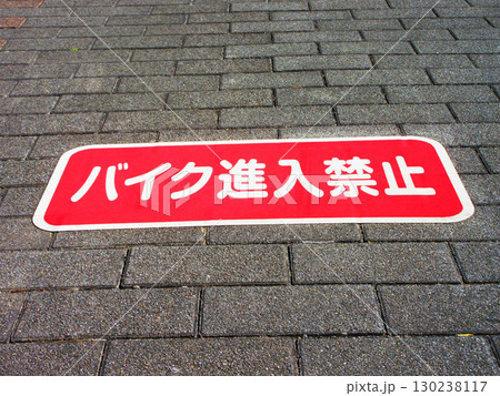 住宅街の歩行者・自転車専用通路 バイク進入禁止の車止め標識の写真