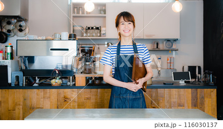 売り上げ集計する女性カフェオーナー