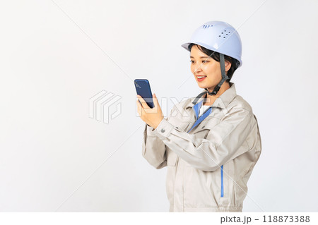 スマホを使うヘルメットと作業服を着た女性 作業員 エンジニア