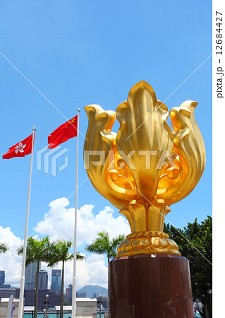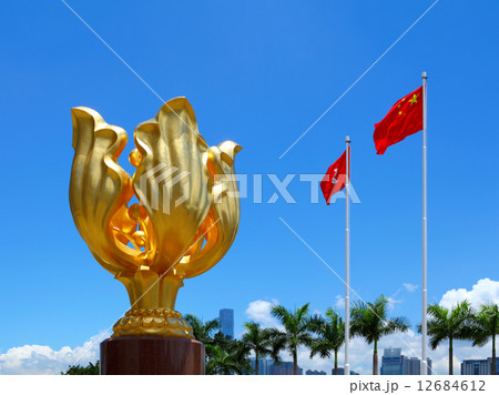 中国国旗(五星紅旗、上)とバウヒニア(洋紫荊)の花をデザインした香港特別行政区旗
