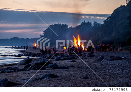 Unrecognisable people celebrating summer solstice with bonfires on beach