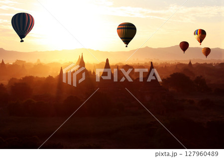 Aerial view on temple, air balloons in Archaeological Zone in sunset light, Bagan, Myanmar. Tourist attraction balloon flight in Pagan, Burma. Topic of vacation, travel, trip abroad, cruises and tours