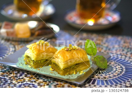 Delicious close up of layered baklava and halva with golden flaky pastry and glistening syrup