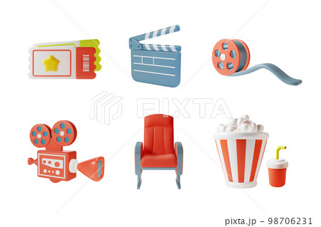 3d Cinema Movie Elements Icons Set Plasticine Cartoon Style Isolated on a White Background. Vector illustration