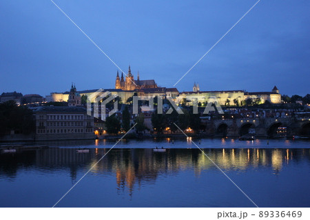 夜のプラハ城とモルダウ川