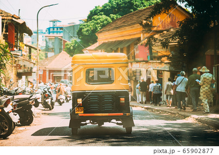 Panaji, Goa, India. Yellow Auto Rickshaw Or Tuk-tuk Moving On Street In Sunny Day