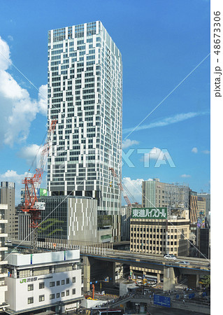 有名なモアイ像で知られる渋谷駅南口のバスターミナルの背景に立つ新しい渋谷ストリームのショッピングビル