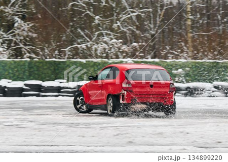 Automobile expertly executing controlled oversteer in winter conditions