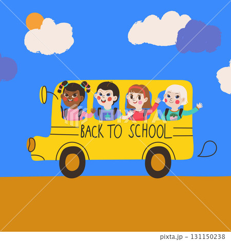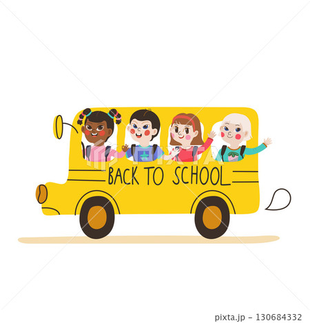 Vector illustration of a yellow school bus with funny cute kids inside and clouds, for Back to School templates
