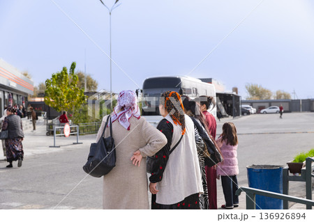ウズベキスタンのガススタンドで白タク待ちの女性達