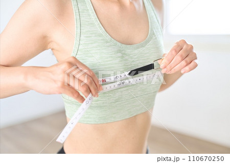 Woman measuring her under breasts.