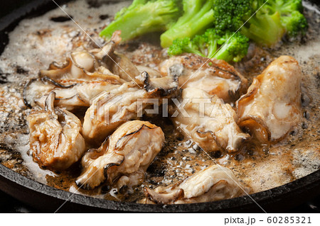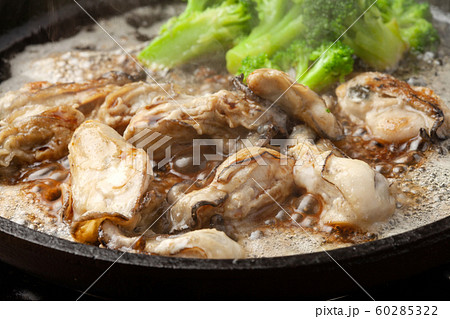 牡蠣のバター醤油焼き、牡蠣料理、カキのバター醤油焼き。カキ料理、牡蠣のソテー。しめじとホウレンソウ。