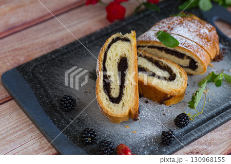 Homemade poppy seed roll with powdered sugar on a tray
