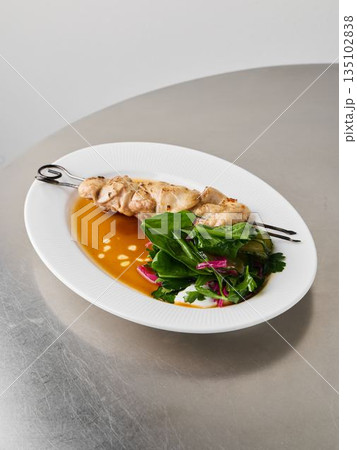 Gourmet fish dish with vibrant sauce and artistic plating