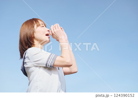 青空の下で呼びかける女子高生