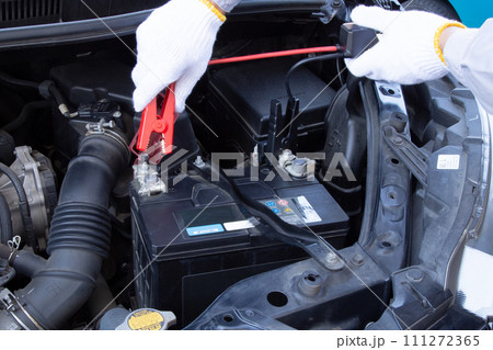 車のバッテリーのトラブル(ワニ口クリップを持つ整備士)