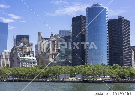 ニューヨーク フェリーから見たバッテリーパークとビル群