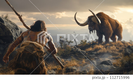 Neanderthal man stands against big woolly buffalo, primitive hunter and animal in prehistoric era. Concept of caveman, ancient people, hunt, Stone Age