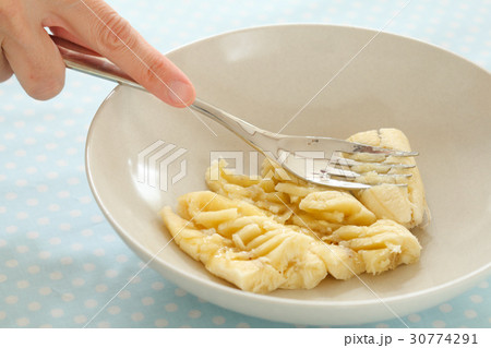 おうちでお菓子作り バナナをフォークの背でつぶすシーン