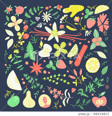 Herbal Tea shop hand drawn big set. Design with herbal tea ingredients. Hand drawn color sketch doodle collection. Vector illustration