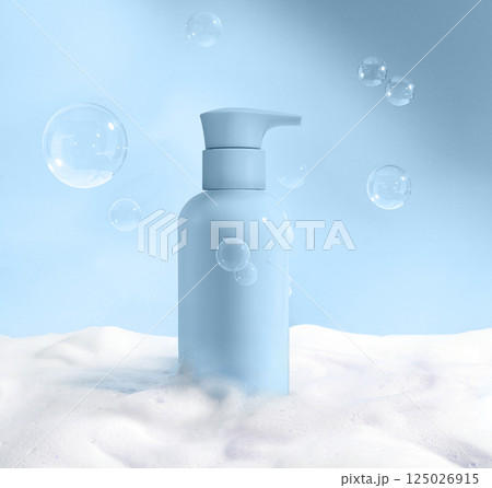A Blue Pump Bottle Gracefully Surrounded by Bubbles on a Soft Foam Background Surface