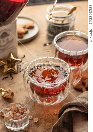 Pouring black tea into transparent glass cup from teapot on brown textured table background. Frozen spalshes of tea in cup