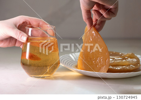 Chilled kombucha amber served with a slice of lemon, cocktail or lemonade with mint or basil