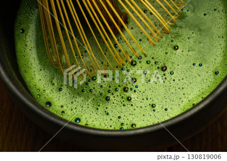 Bamboo whisk preparing foamy matcha green tea