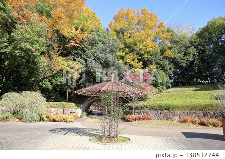 バラのポールスタンド 背景 黄葉 雑木林