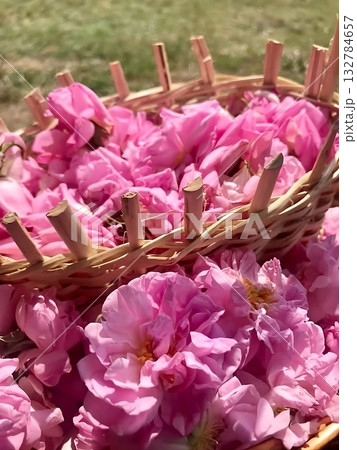 ダマスクローズ畑で、花籠に摘みたての花びら / Fresh Damask Roses