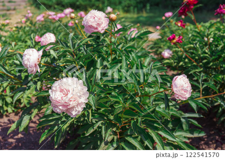 Vibrant fresh pastel pink peony flower bush blooming in the garden in sunny day, floral background