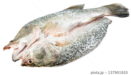 Raw butterfly cut barramundi or Asian sea bass fish isolated. Fresh seafood ready for cooking or grilling. Whole fish split open showing silver skin and scales.