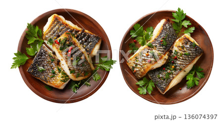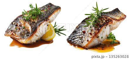 Grilled or pan-seared native Australian Barramundi fish fillet with crispy skin, garnished with herbs and lemon wedge, on white