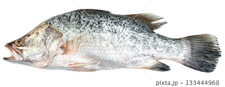 Freshly caught Barramundi fish isolated. This large, silver-scaled fish is a popular food source, ideal for culinary and seafood industry visuals. Raw ingredient preparation.