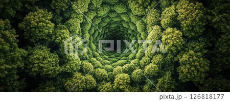Spiral forest illusion created by dense green trees forming a tunnel effect. Optical art and nature harmony concept