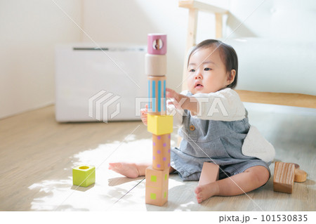 積み上げた積み木を倒して遊ぶ赤ちゃん