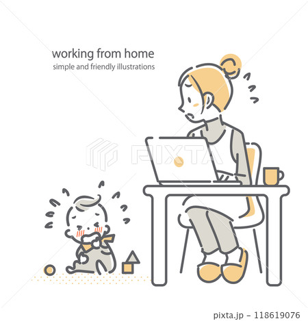 自宅でのテレワークに苦労するお母さん シンプルでお洒落な線画イラスト