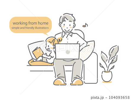 在宅勤務で子供と一緒に充実した時間を過ごすお父さん シンプルでお洒落な線画イラスト