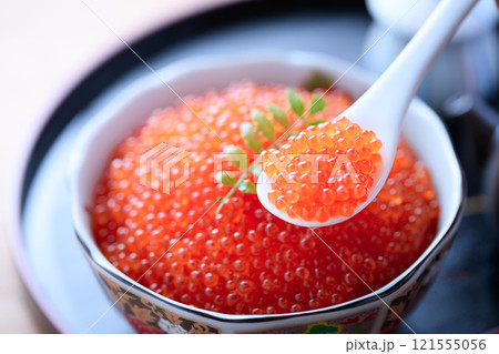 茶碗に盛ったいくらの醬油漬けのクローズアップ