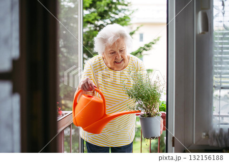 Man Watering Balcony Plants With Green Watering Can In Urban Apartment Garden